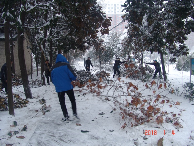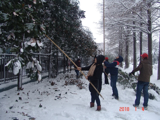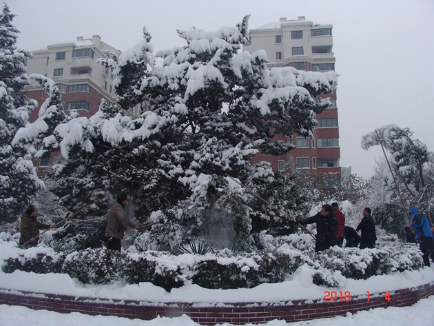 2018年的第一場(chǎng)雪,給花園式單位的我院裝扮的更加美麗,院內中心花園及綠化帶內種植的桂花、香樟、廣玉蘭等景觀(guān)樹(shù)木裹上了厚厚的銀裝,但同時(shí)也給人們的出行帶來(lái)不便和安全隱患。過(guò)厚的積雪也壓折了部分景觀(guān)樹(shù)木的枝干,壓折的枝椏倒路上阻礙行人和車(chē)輛通行,路面的積雪也亟待清理。