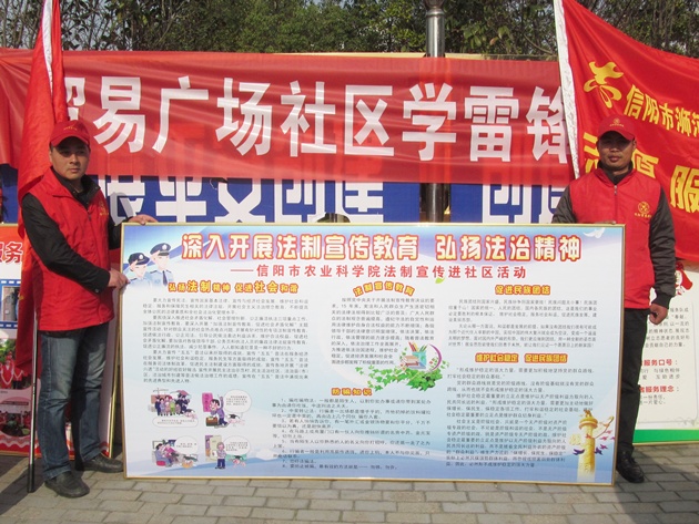 3月24日上午,我院組織普法宣傳志愿服務(wù)隊走進(jìn)文明共建的浉河區湖東辦事處五星社區開(kāi)展了“法制宣傳進(jìn)社區  普法意識入人心”專(zhuān)題普法宣傳活動(dòng)。