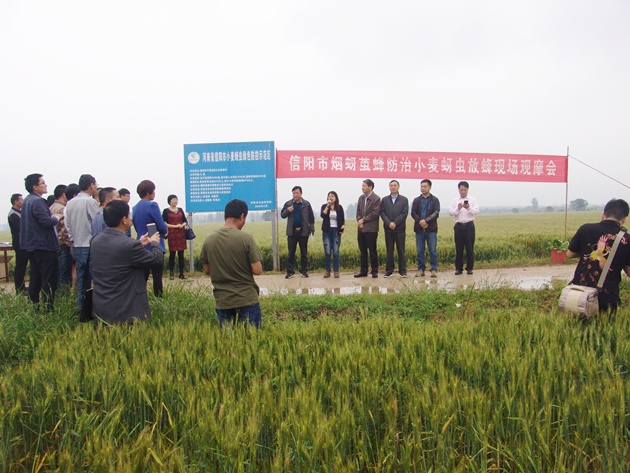 5月11日,由省農科院煙草所主辦、我院承辦的商品糧大省獎勵資金示范推廣項目“煙蚜繭蜂防治蚜蟲(chóng)技術(shù)應用示范”2018年度放蜂現場(chǎng)觀(guān)摩交流會(huì )在我市召開(kāi)。省農科院副院長(cháng)衛文星,省農科院煙草所所長(cháng)李淑君、黨委書(shū)記程澤強,我院、信陽(yáng)煙草公司有關(guān)領(lǐng)導及專(zhuān)家,我市部分縣區小麥、蔬菜、茶葉種植大戶(hù)100余人參加了會(huì )議。