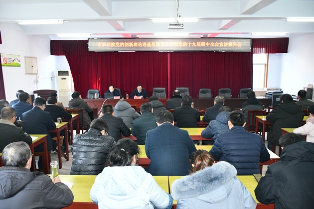 在兩個(gè)小時(shí)的宣講中,蔣文俊緊緊圍繞全會(huì )《決定》和習近平總書(shū)記的重要講話(huà),從充分認識堅持和完善中國特色社會(huì )主義制度、推進(jìn)國家治理體系和治理能力現代化的重大意義,深刻領(lǐng)會(huì )中國特色社會(huì )主義制度和國家治理體系的顯著(zhù)優(yōu)勢、堅定中國特色社會(huì )主義制度自信,準確把握堅持和完善中國特色社會(huì )主義制度、推進(jìn)國家治理體系和治理能力現代化的總體要求、總體目標和重點(diǎn)任務(wù),加強黨的領(lǐng)導、以高度的思想自覺(jué)政治自覺(jué)行動(dòng)自覺(jué)貫徹落實(shí)全會(huì )精神等方面對十九屆四中全會(huì )精神進(jìn)行系統闡述和深入解讀。宣講報告主題鮮明、視野開(kāi)闊,深入淺出、精辟透徹,既有政治高度,又有理論深度,更有實(shí)踐啟發(fā),對全面學(xué)習領(lǐng)會(huì )全會(huì )精神,推動(dòng)全會(huì )精神在農科院落地生根具有很強的指導意義。