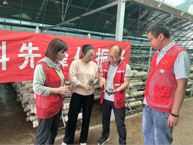 在新縣田竹種養殖農民專(zhuān)業(yè)合作社,任務(wù)團隊走進(jìn)灰樹(shù)花出菇大棚,仔細查看了正在進(jìn)行催菇管理的菌袋,發(fā)現原基產(chǎn)生較少生長(cháng)分化較為緩慢。通過(guò)檢測出菇大棚的二氧化碳濃度和光照、溫濕度數據,團隊指出出菇棚內濕度偏低,光照和氧氣供應不足是導致灰樹(shù)花出菇進(jìn)展緩慢的主要原因,并針對性給出建議:一是增加棚內濕度,通過(guò)噴霧狀水,保持空氣相對濕度85%-95%;二是控制棚內溫度,通過(guò)使用濕簾和噴淋深井水,保持環(huán)境溫度22-25℃;三是提高棚內光照強度,掀起棚邊遮陽(yáng)網(wǎng),使光照強度保持200-500lx,四是保持微風(fēng)輕拂,通過(guò)安裝紗網(wǎng)和懸掛黃板做好防蟲(chóng),避免高溫高濕導致病蟲(chóng)害發(fā)生。通過(guò)這些管理,確;覙(shù)花原基發(fā)生和正常分化成菇。