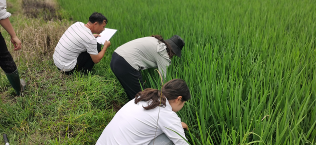 科研人員頂著(zhù)炎炎烈日,查看水稻長(cháng)勢,仔細檢查葉片顏色、形態(tài)和發(fā)育情況。對發(fā)現的病蟲(chóng)害問(wèn)題進(jìn)行了詳細分析。經(jīng)過(guò)調查,發(fā)現當前信陽(yáng)晚播水稻主要面臨稻薊馬、稻水象甲的威脅,早播稻田中有部分田塊中華稻蝗形成為害,零星發(fā)現一些稻縱卷葉螟、稻飛虱和二化螟等。針對這些問(wèn)題,科研人員現場(chǎng)為農戶(hù)們講解了水稻常見(jiàn)病蟲(chóng)害的識別方法、發(fā)生規律以及防治措施和防治建議,鼓勵農戶(hù)進(jìn)行綜合防治,采用物理防治、生物防治等綠色防控技術(shù),減少化學(xué)農藥的使用,保護生態(tài)環(huán)境。對田間雜草防治等問(wèn)題,科研人員也給出了防控意見(jiàn)。